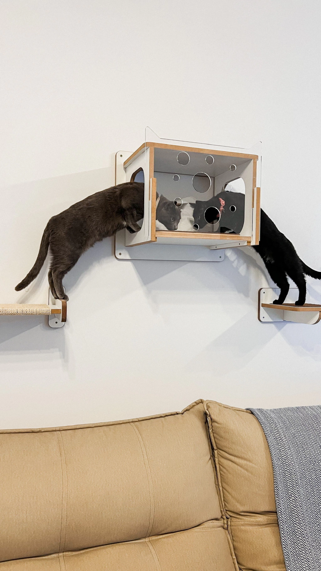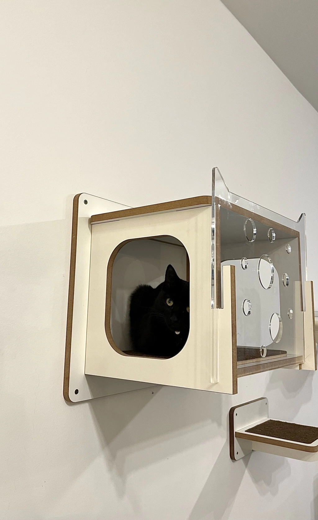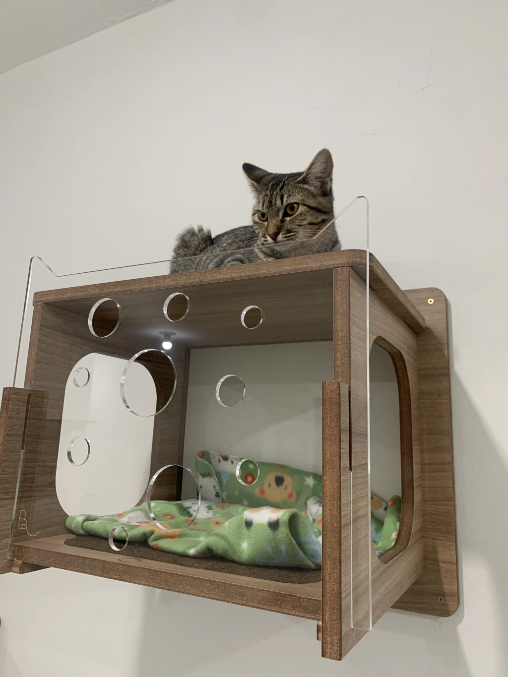 A toca, baseada na nossa toca Hórus, vem para os gatos que gostam de um descanço nas alturas. Pode ser utilizada em casas multicats também pois tem carpete dentro e na sua parte superior (com refil!); O acrílico deixa a toca com um ar mais leve e também, você pode observar de longe o seu gato! E claro, ele também tem uma visão incrível de cima dela <3